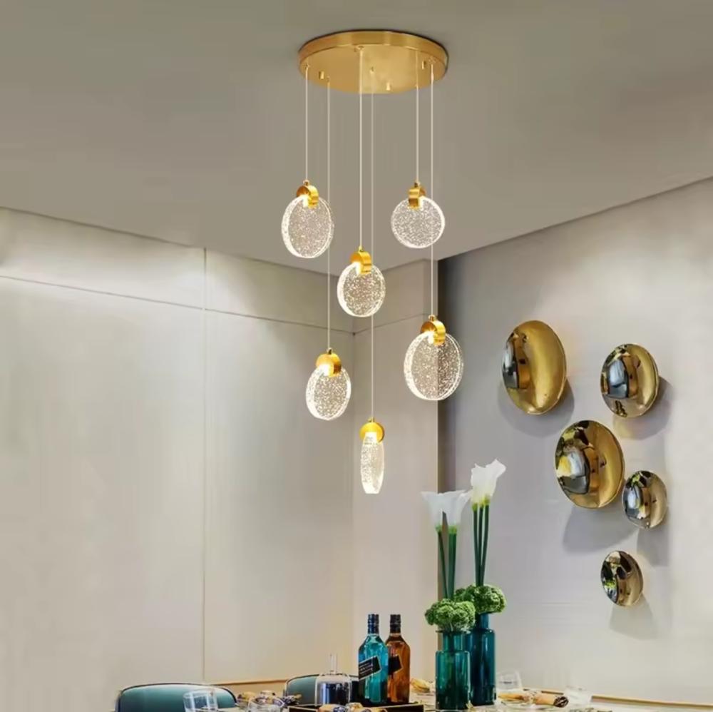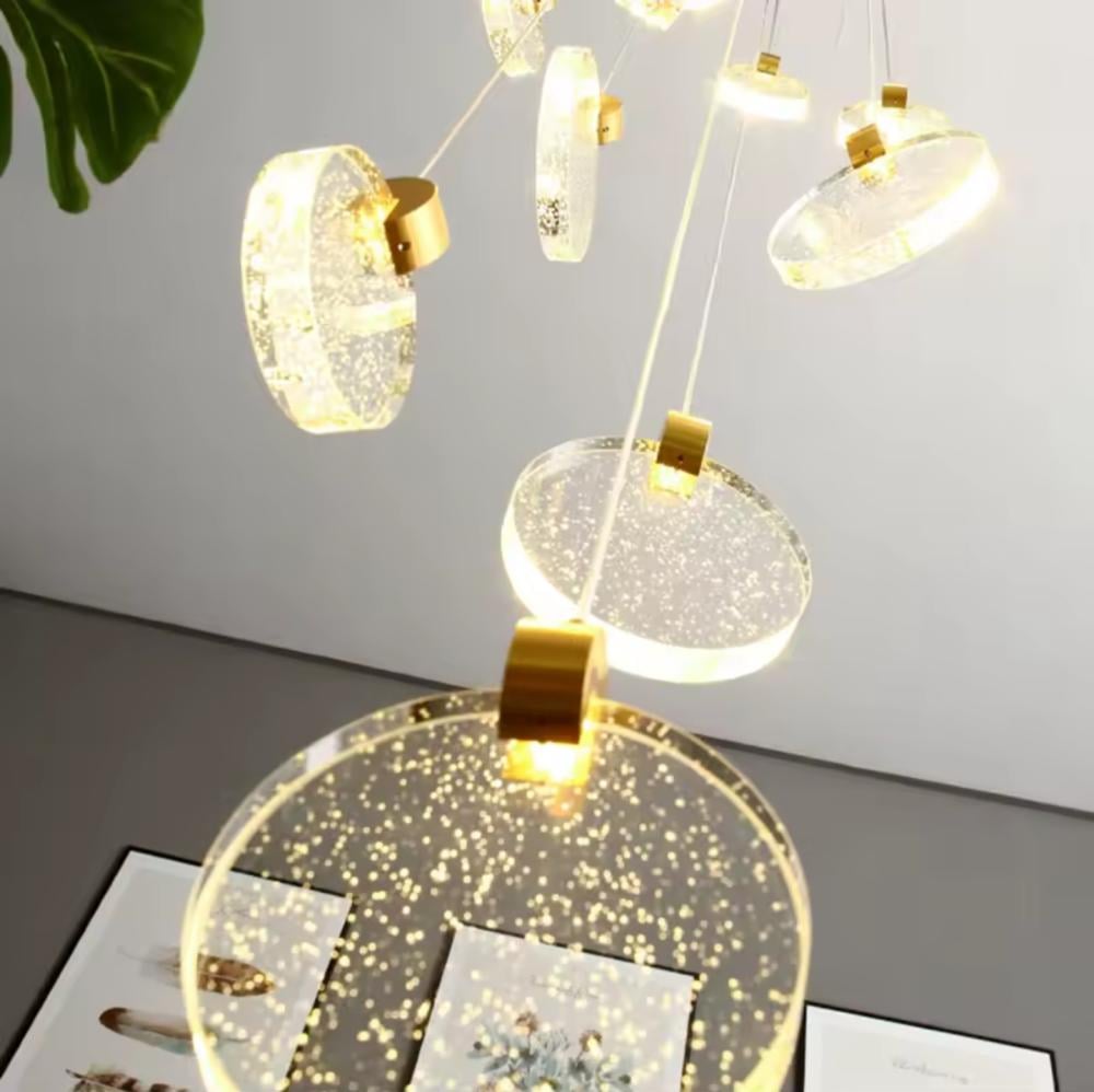 تُقدم هذه الثريا تحفة فنية مُضاءة، مُصممة بدقة لتُحدث فرقًا في أي ديكور. تتكون من خمس لمبات LED ذات إضاءة صفراء دافئة ومُريحة للعين، مُثبتة داخل أقراص زجاجية شفافة مُزينة بفقاعات متلألئة تُحاكي قطرات الندى المتجمدة، لتُضفي بريقًا استثنائيًا يملأ المكان بالضوء والجمال.