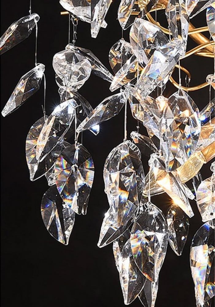 تجسيد فني لعناقيد ورق الشجر بتفاصيل كريستالية، يتضمن 22 موقع لمبة ليد E14 لتوزيع ضوء متوازن.