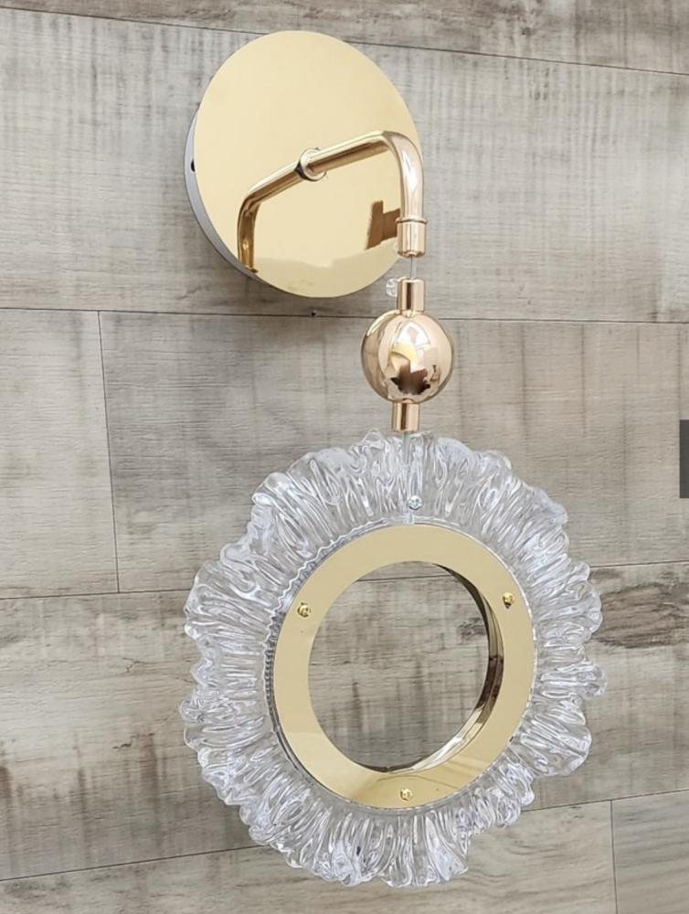 تُعد هذه الإنارة الجدارية قطعة فنية أنيقة وفاخرة، تضفي لمسة من الرقي على أي مساحة داخلية. تتميز بتصميم دائري فريد، يجمع بين المعدن الذهبي اللامع والاكريليك الشفاف ذو النقوش المتعرجة، مما يخلق تلاعبًا ساحرًا بالضوء.